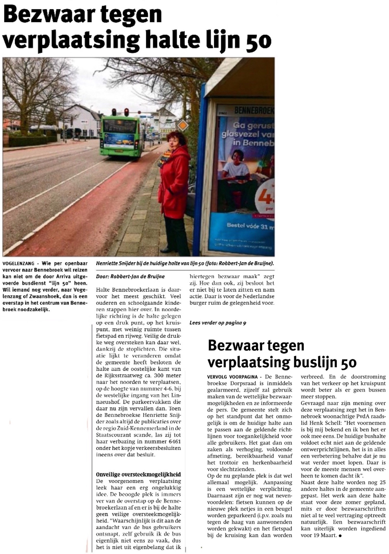 Burgemeester en wethouders hebben besloten de bushalte Bennebroekerlaan te verplaatsen naar de Rijksstraatweg ter hoogte van nr 4-6. De Dorpsraad heeft hiertegen bezwaar gemaakt.